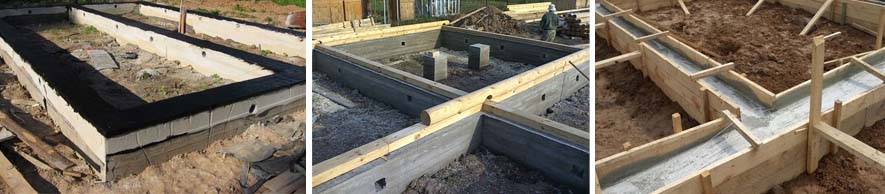 Монолитные бетонные и сборные несущие конструкции могут иметь два вида исполнения: ленточные и столбчатые. Существует множество отличий при производстве работ по устройству этих видов фундаментных конструкций: