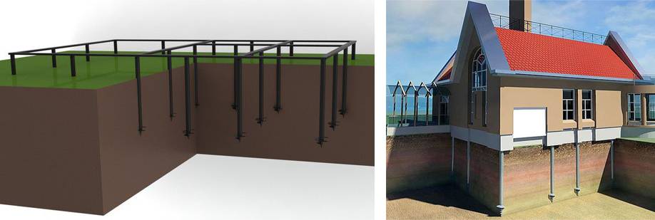 Грунтовые воды находятся вблизи от поверхности почвы — требуется установка свайного фундамента при достаточно глубоком их вбивании. Сваи должны имеет расширение в нижней части с целью предупреждения их выталкивания из земли, особенно при вспучивании при низких температурах. Рекомендуется их применение винтового типа, так как они снабжены лопастями на нижнем заостренном конце. Их устанавливают методом вкручивания в грунт, при котором лопасти не взрыхляют почву, а углубляются методом подрезания пластов земли, причем структура сохраняет свою плотность. Монтаж свай производится до момента вкручивания до расчетной глубины, которая должна находиться ниже уровня подземных вод и точки промерзания. Таким образом возводить фундамент на пластичных глинистых почвах считается наиболее перспективным мероприятием.