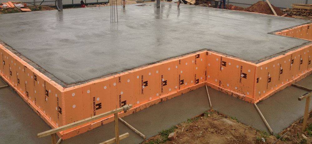 - Утепление фундамента под плитой. Первый способ — утеплитель (пенополистирол) прокладывают под всей площадью плиты. При укладке теплого пола используют ППС толщиной не менее 30 см. Второй способ — утепляют стены фундамента, опуская ППС ниже основания, и отмостку, чуть выходя за края.