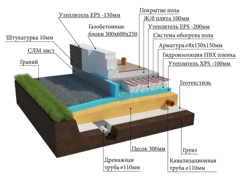 Большое преимущество плитного фундамента и в том, что чаще всего не приходится рыть котлован, так как достаточно мелкозаглубленного варианта.