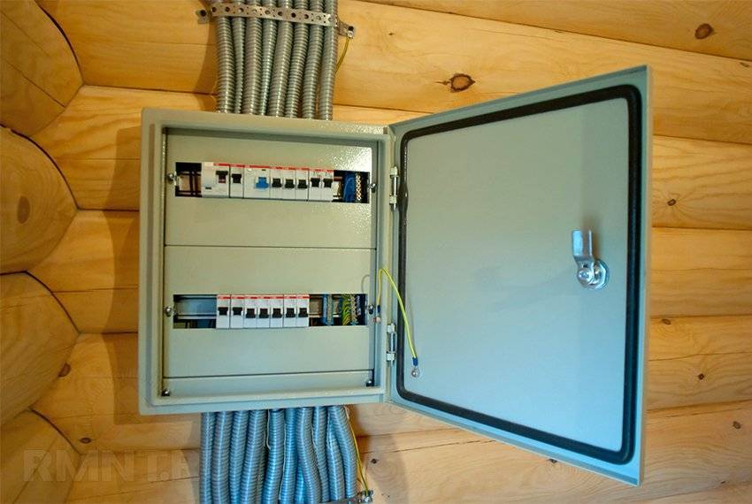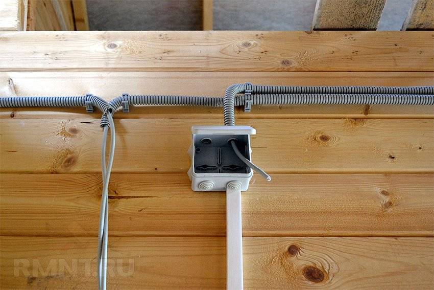 Все тусо-распаячные коробки, розетки и выключатели, электрощит должны быть только наружной установки. По правилам противопожарной безопасности запрещается устанавливать распаячные коробки, выключатели и розетки в моечной/парной — только в предбаннике. Не шутите с возможностью короткого замыкания в деревянном строении — вся внутренняя проводка бани должна быть выполнена только в негорючем гофрошланге, закреплена на специальные клипсы, проход кабеля через перегородки — только через стальную трубу.