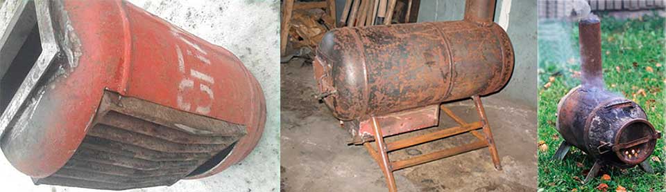 Первым делом следует определиться, из чего будет выполнен корпус печки. Металл желательно выбрать толстый, чтобы дольше не прогорал. Чаще всего такая буржуйка изготавливается из газового баллона объемом 50 л. Можно использовать толстостенную трубу большого диаметра либо стальную бочку объемом 200 л, но ее стенки тоньше.
