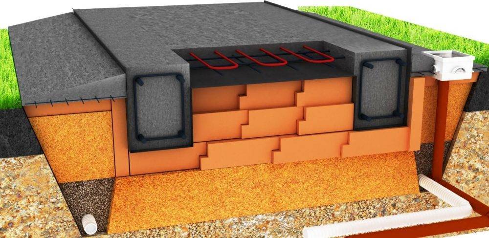 - Материалы: песок, гравий, геотекстиль, трубы для дренажа, бетон, экструдированный пенополистирол, доски для поддержки опалубки, система теплого пола.
