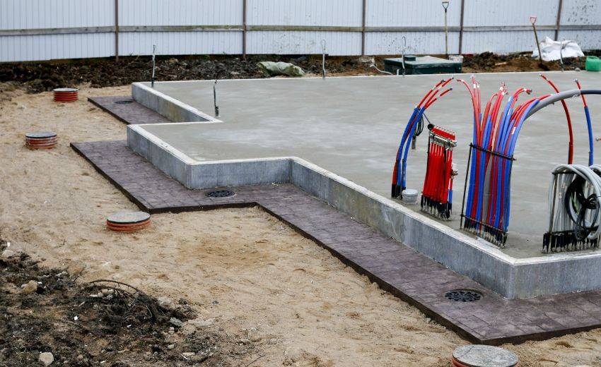 Все инженерные коммуникации должны быть уложены до создания монолитного основания, поэтому их располагают на песчаной подушке с уплотнением согласно плану разводки ниже уровня промерзания. Все концы труб необходимо вывести на поверхность для дальнейшего подключения системы. Для повышения ремонтопригодности сетей трубы лучше укладывать в футляры большего диаметра. Для канализационной системы следует предусмотреть снаружи колодец, чтобы можно было выполнять ревизию канализации и ее ремонт.