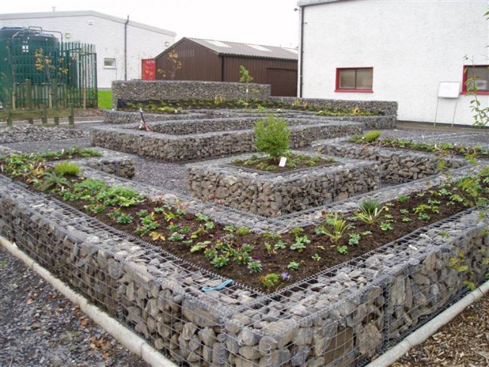 Затем в пространство между засыпным материалом насыпают грунт, высаживают растения, цветы. Последующий уход за грядкой ничем не отличается от обычных работ в цветнике или огороде. Преимущество грядки из габионов – эстетика и высота. Хозяева получают приподнятые грядки, на которых удобнее работать.