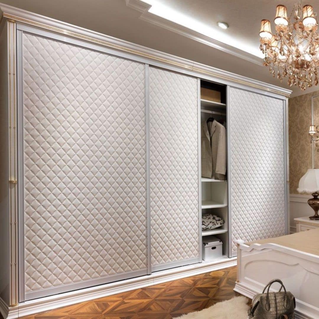 В новых моделях встречаются дверцы с экокожей. Такие шкафы-купе подходят для гостиной, кабинета, спальни. Покрытие крепится на планки из МДФ либо ДСП и комбинируется с накладками из стекла, металла, зеркал.
