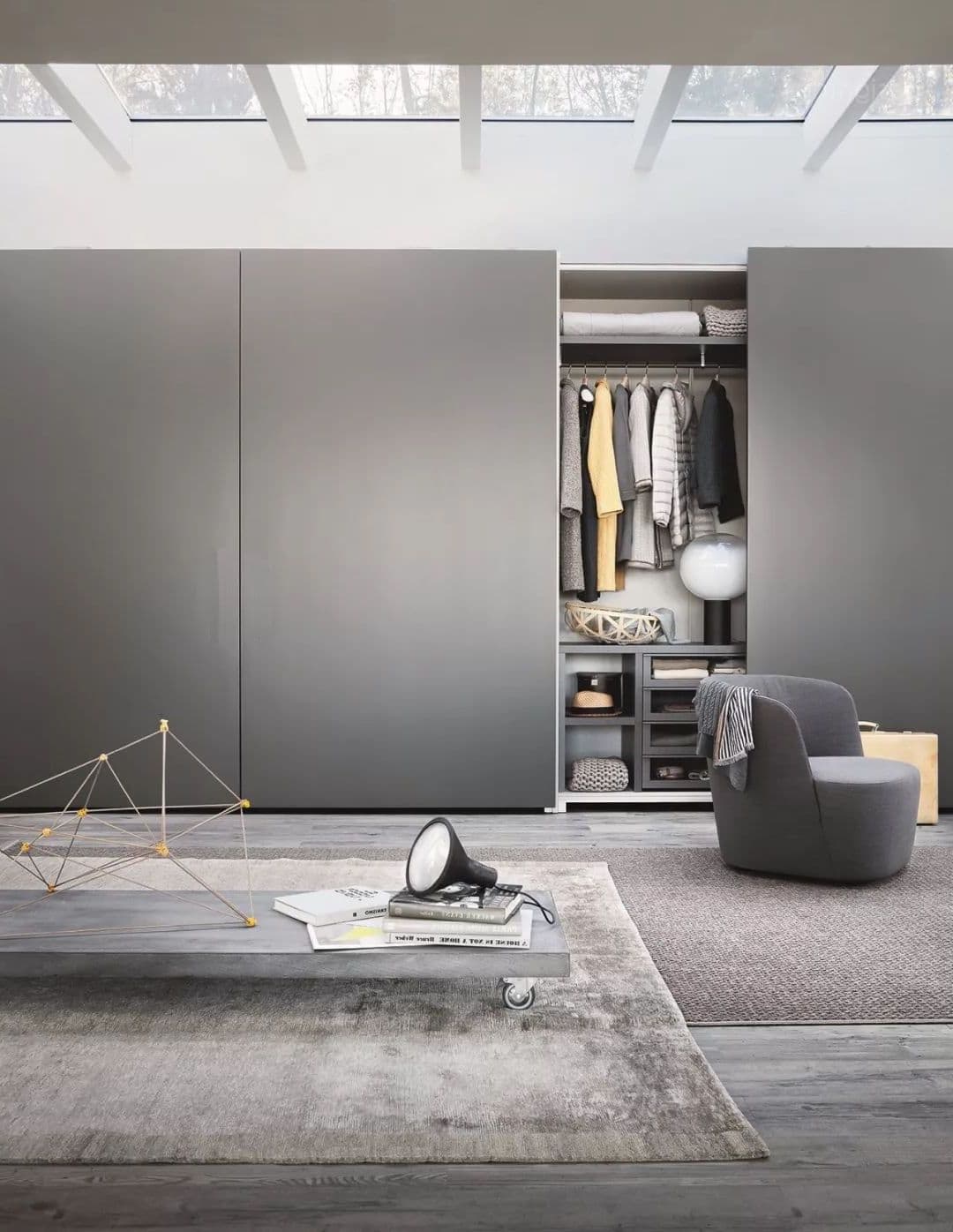 Шкаф-купе с большими створками глухой серой покраски отлично впишется в скандинавский стиль интерьера