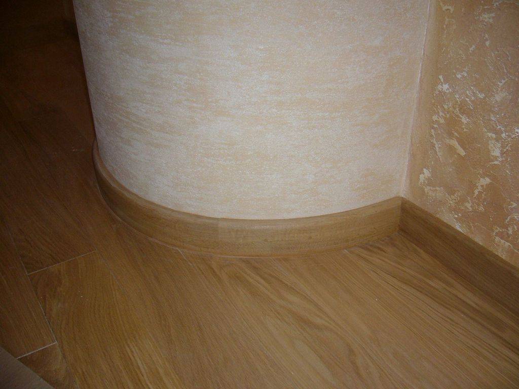 , вещество, напоминающее внешне древесину и застывающее при контакте с воздухом. В качестве монтажа напольных плинтусов этот материал применяется крайне редко, так как не всегда удается придать ему необходимую конфигурацию, а стоимость его немаленькая (30-40$ за фрагмент 40-50 см). Чтобы создать криволинейную имитацию деревянного бордюра прибегают к всевозможным хитростям и технологическим уловкам и делают это с помощью монтажа перечисленных выше материалов, поэтому рассмотрим, какие варианты пластиковых, пробковых и полиуретановых мягких напольных плинтусов предлагают производители.