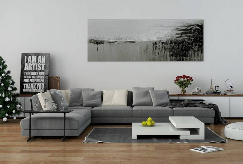 Диван с серой однотонной обивкой можно использовать в классическом и в современном интерьере
