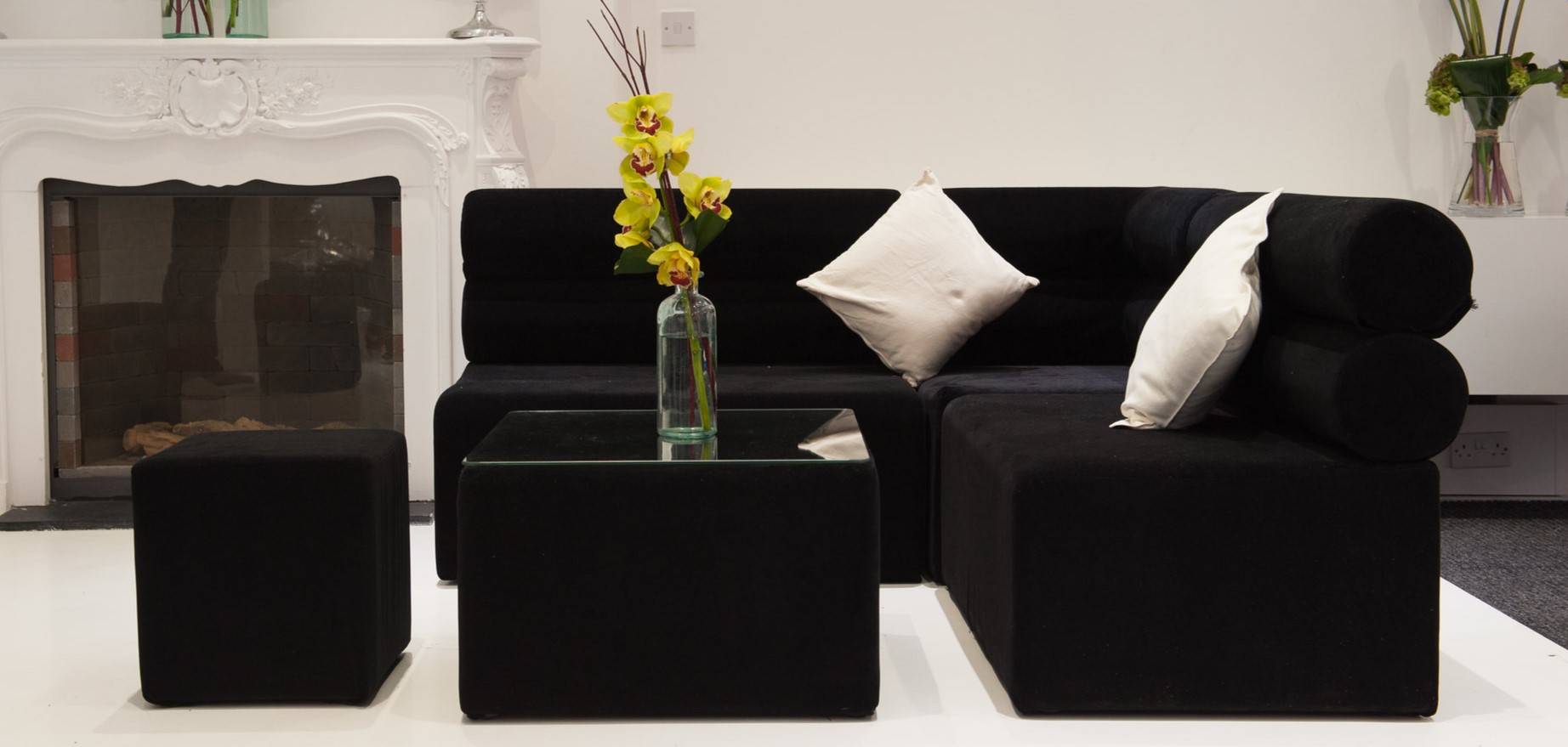 Черный модульный диван отлично дополняет светлый интерьер гостиной