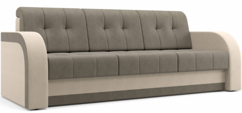 При первом взгляде на этот диван бросаются в глаза закругленные подлокотники, отделанные полимерными накладками. Размер спального места – 164*206 см, раскладывается в состояние кровати благодаря механизму “аккордеон”. Дополнительные вещевые ящики и полки для хранения не предусмотрены.