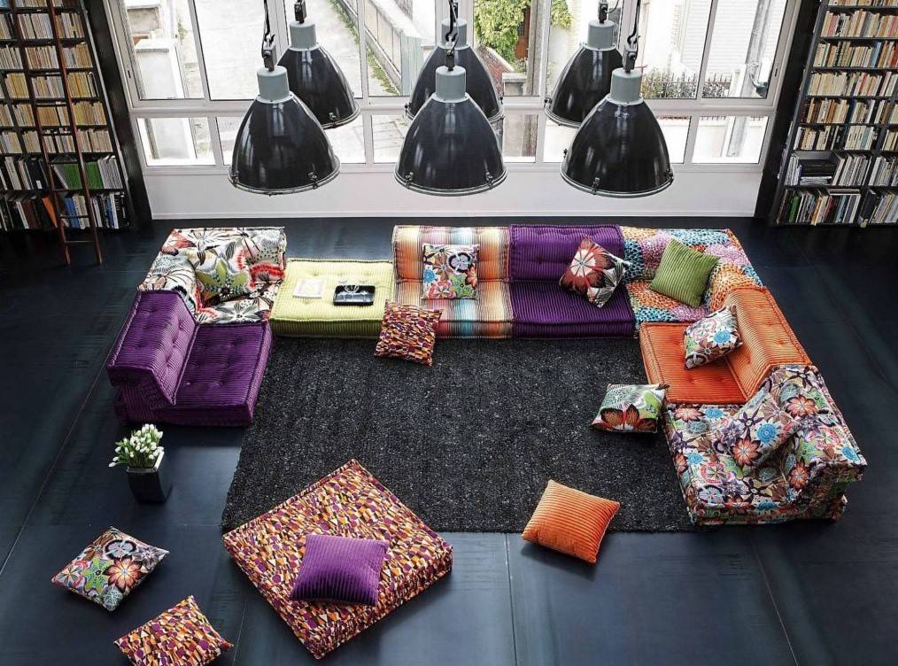 Диван из разноцветных модулей является ярким акцентом в интерьере гостиной