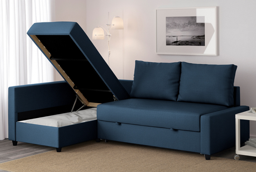Если диван предполагается на день складывать, то необходимо позаботиться о системе хранения постельных принадлежностей. Рекомендуется сразу выбрать модель с встроенным ящиком для белья. В моделях с механизмами «книжка», «еврокнижка», «клик-кляк» они достаточно вместительные.
