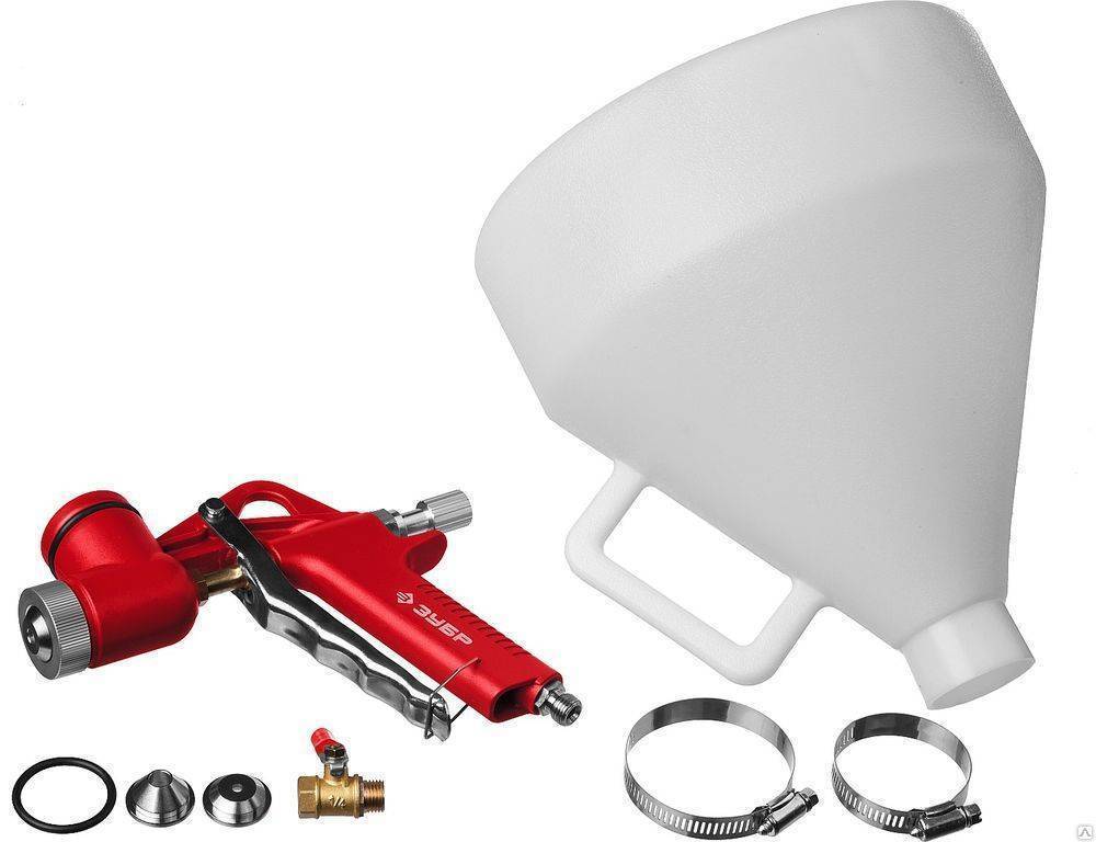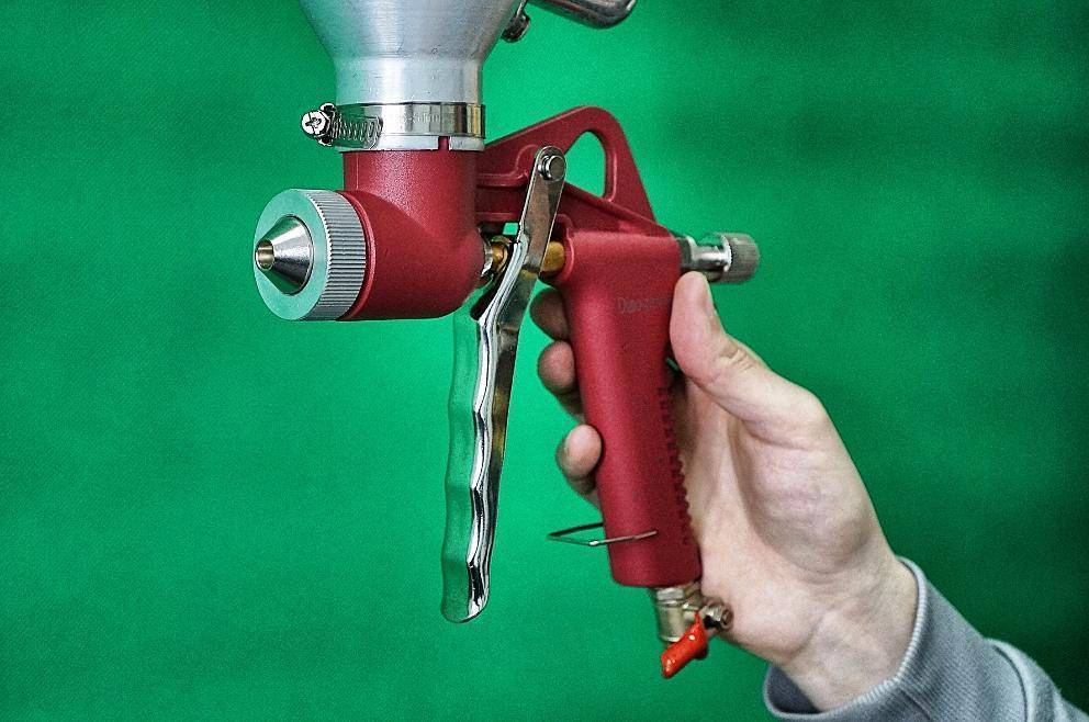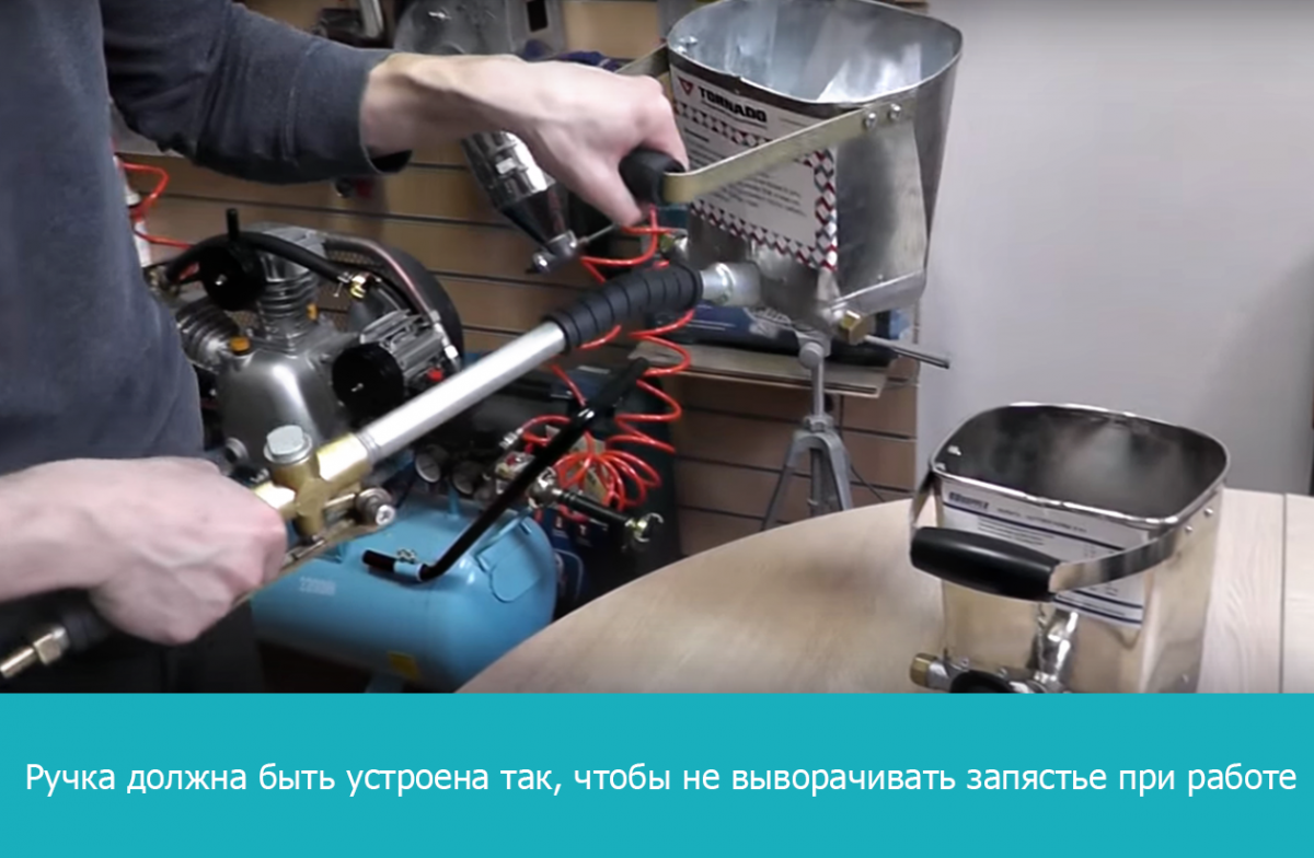 Основное отличие пистолета от хоппер-ковша в том, что у последнего раствор поступает в отдельную емкость с несколькими отверстиями. Кроме того, у пистолета площадь разбрызгивания зависит от угла, под которым воздушная масса будет поступать к раствору, а у хоппер-ковша угол не имеет значения.