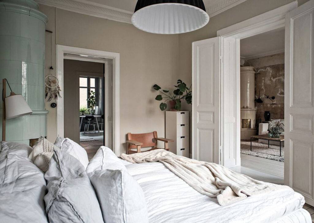 - Скандинавский стиль отдает должное белоснежным стенам, мебели и простыням, чтобы стало светлее и радостней в помещении.