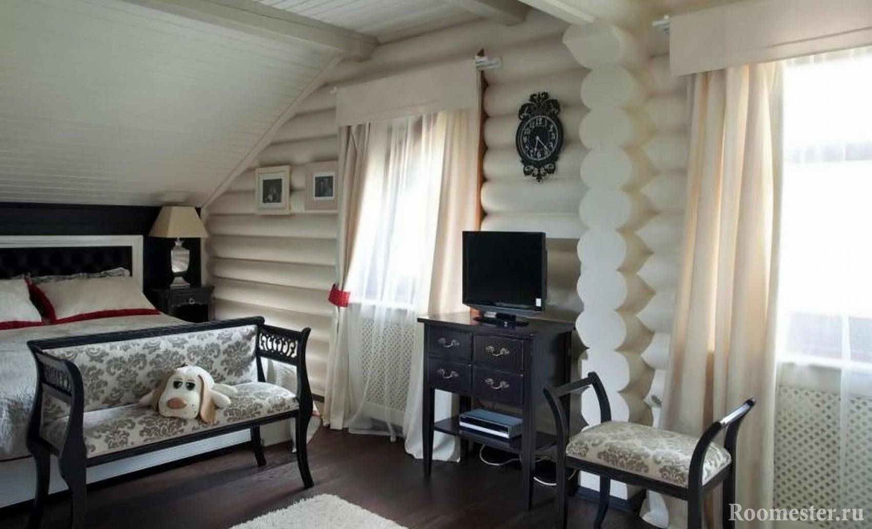Выбеленные бревна и темная отделка, мебель в тех же цветах. Нелинейный потолок из вагонки создает интересный визуальный эффект, а изюминка — округлая форма бревна