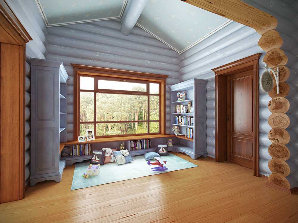 Спальню для детей, оформляют в чистых и светлых цветах с применением прочных, абсолютно безопасных и эстетически привлекательных материалов и предметов меблировки. Оцилиндрованное бревно позволяет сформировать сказочную атмосферу в комнате.