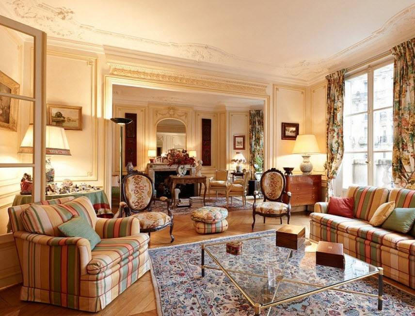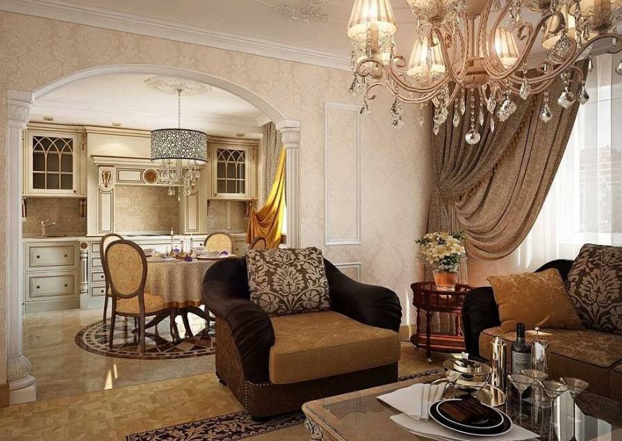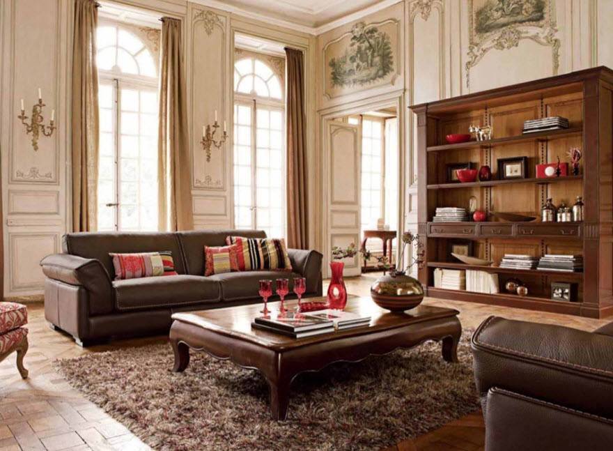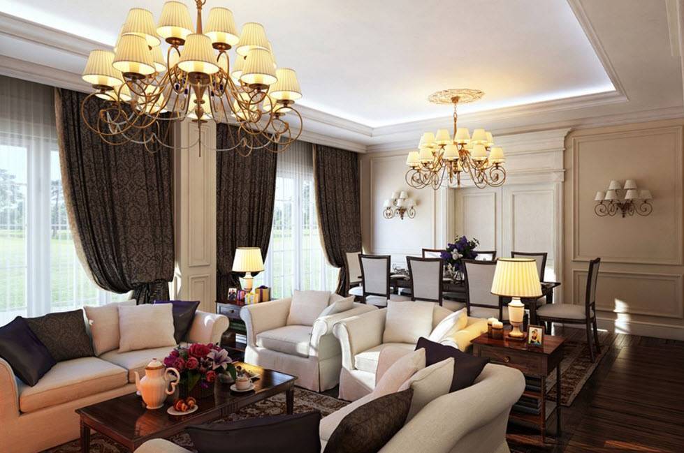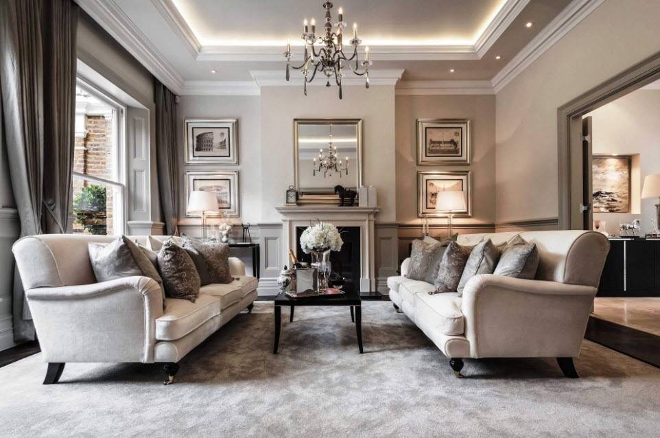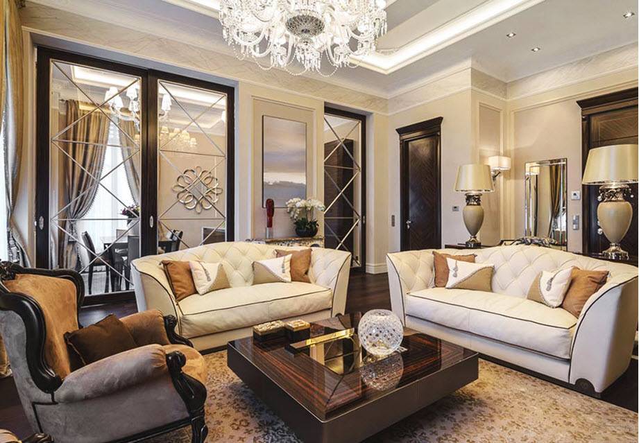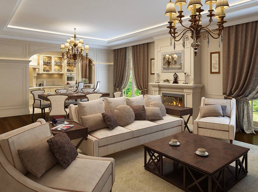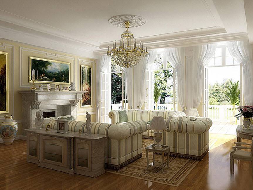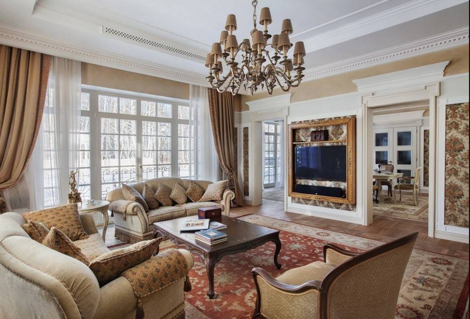 Обдуманное украшение для гостиной комнаты в классическом стиле планируется не только в огромном доме. По тем же принципам оформляется:
