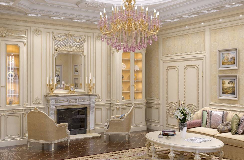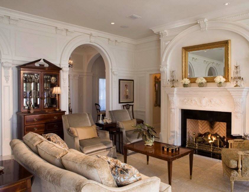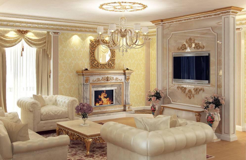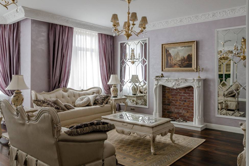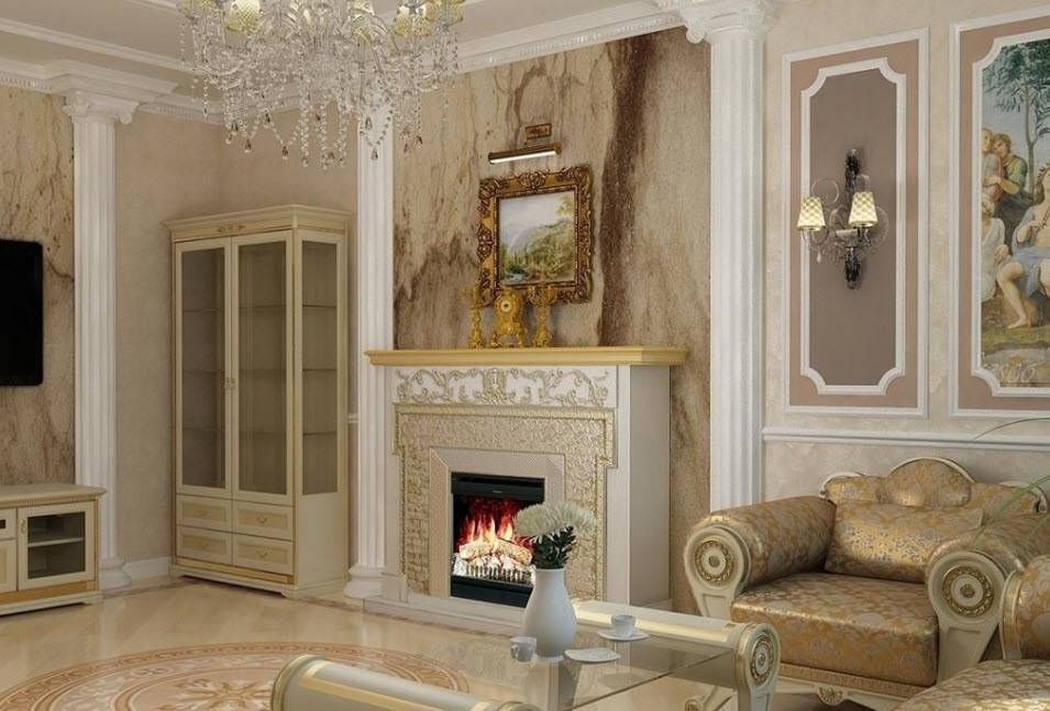 Создание однотонного основания в пастельных тонах. Для отделки используют колоны и лепнину, декоративную штукатурку. Дополнить изысканную атмосферу поможет настоящий дровяной камин.