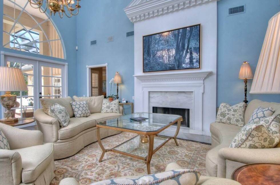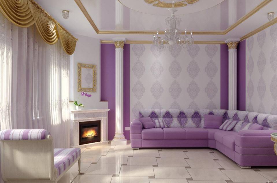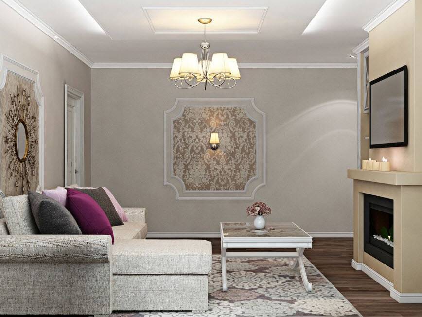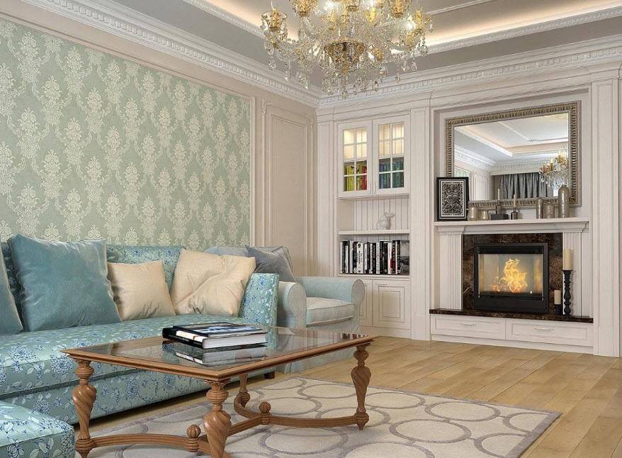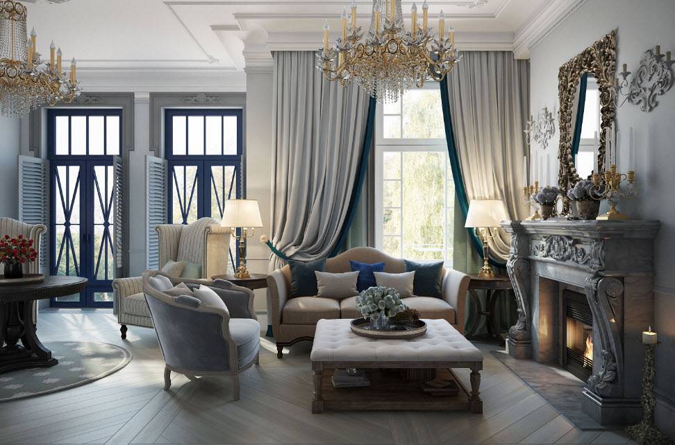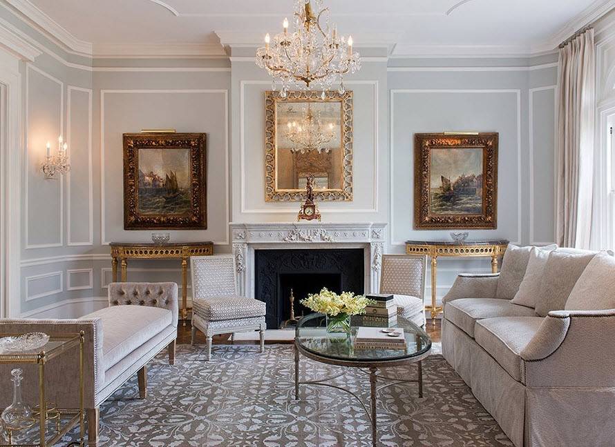 Создание однотонного основания в пастельных тонах. Для отделки используют колоны и лепнину, декоративную штукатурку. Дополнить изысканную атмосферу поможет настоящий дровяной камин.