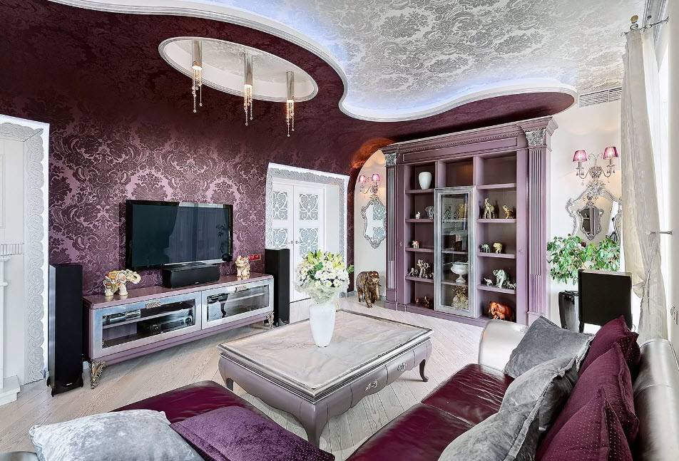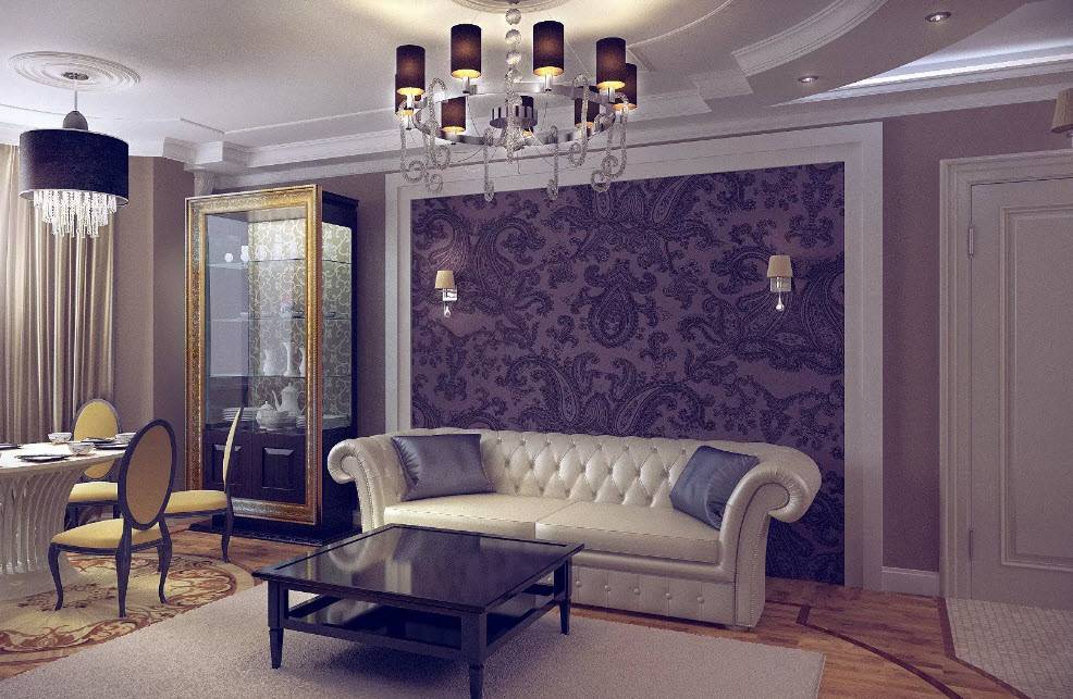 - Отделка стен может быть разнообразной. Такие гостиные могут быть оштукатурены, окрашены или же оклеены обоями. В подобном дизайне используются как однотонные, так и орнаментальные покрытия. Чаще всего выбирают качественные обои с крупным рисунком, получившим название «Дамаск». Для него характерны витиеватые узоры с растительными или абстрактными мотивами. Покрытия могут иметь текстильный наружный слой, напоминающий по текстуре бархат, атлас, сатин.