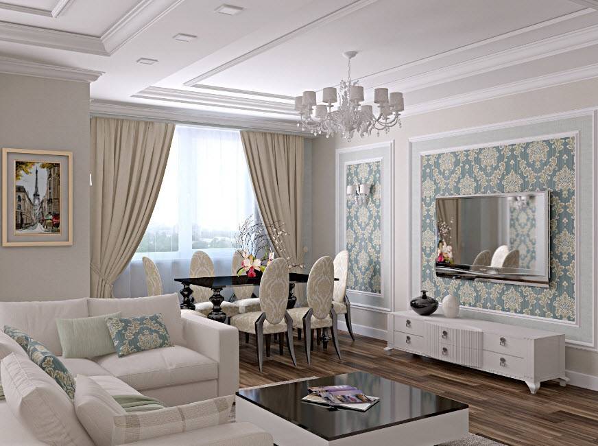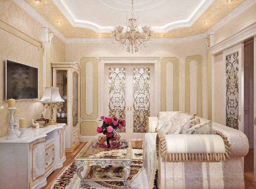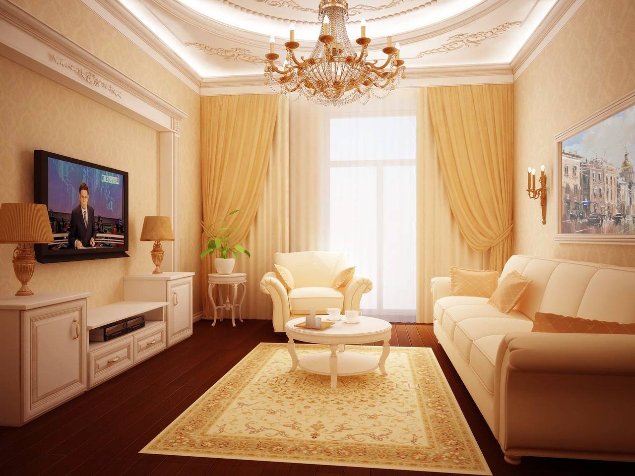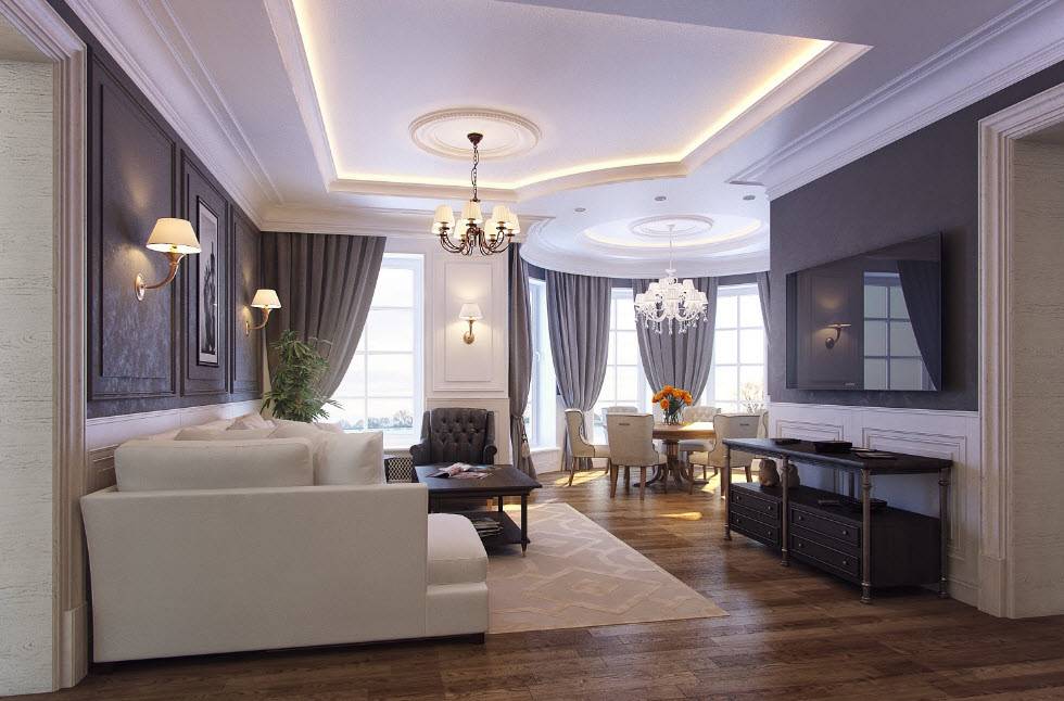 Идеальные исходные данные комнаты — простор, высокие потолки, правильная форма. Небольшие залы тоже оформляют в классическом стиле, правда работы будет гораздо больше.