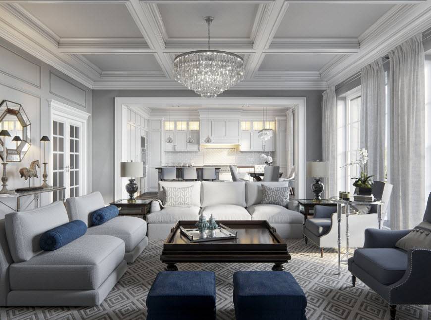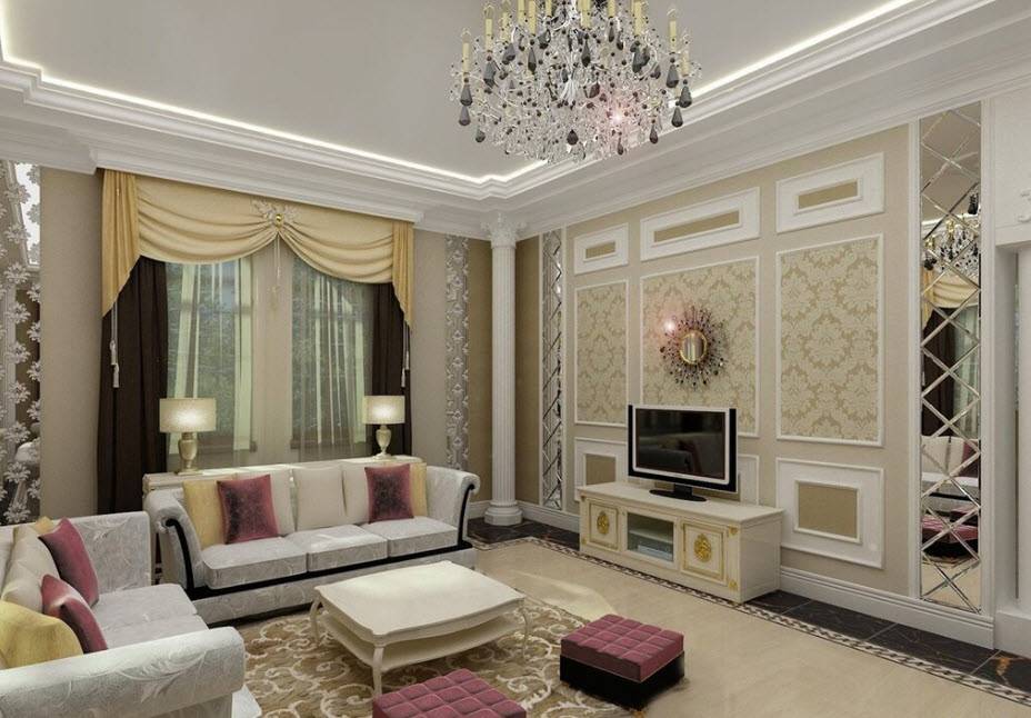 Это многофункциональная поверхность в классических гостиных. Он является элементом декора, корректором пространства, участником зонирования. Чтобы создать иллюзию высоты комнаты потолок отделывают светлыми красками с глянцем.