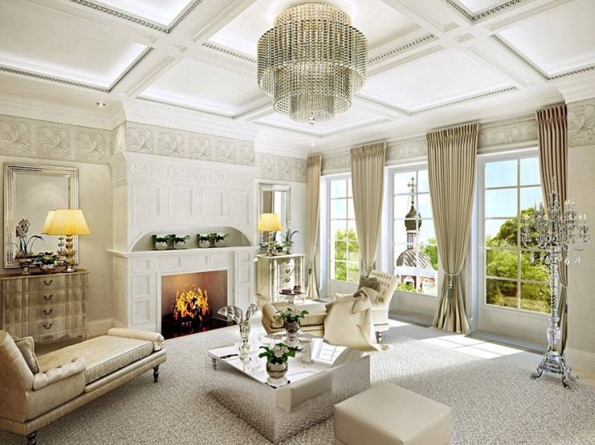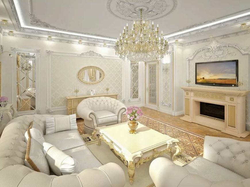 Резной белый потолок с гипсовой лепниной непременно должен быть. В современном исполнении это 2-х уровневые потолоки с изобилием лепнинного декора. Сопровождать его должен широкий потолочный плинтус. Белая гостиная со светлым потолком выглядит невероятно свежо и благородно.