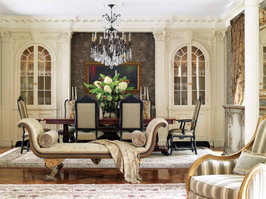 Некоторая мебель, представляющая классический стиль, может выглядеть как элемент дворцовой аранжировки. Например, кресло Людовика будет работать здесь великолепно. Однако антикварную или стилизованную мебель следует смешивать с более простыми моделями. Все элементы классической композиции должны быть выполнены из натуральных и твердых материалов. Шкафы и комоды могут иметь тонкий декор и интересные ручки. Они обычно отличаются натуральным цветом дерева или окрашены легкой краской. Мягкая мебель, такая как диваны, кресла и стулья, должна призывать своим элегантным внешним видом к комфортному отдыху. В классическом интерьере обычно живут семьи, которые проводят время за общим столом. Поэтому этот предмет мебели должен быть в центре внимания столовой, радуя глаз удобной элегантностью.