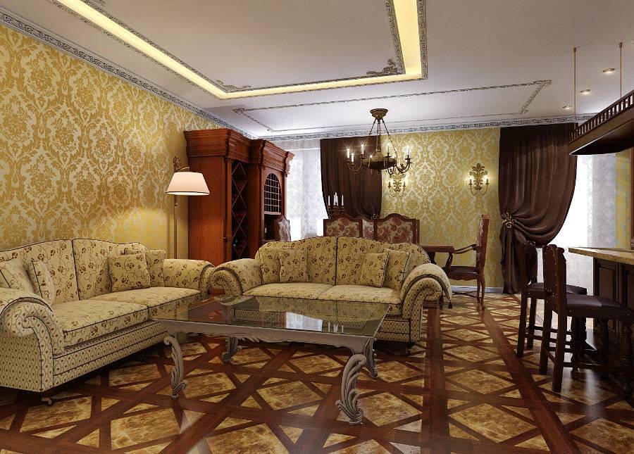 Альтернативным вариантом камню в декоре классических гостиных станет художественный паркет, ламели которого произведены из ценной древесины и высококачественная паркетная доска. В крайнем случае, вышеперечисленные материалы может заменить керамическая плитка, имитирующая их фактуру. Ее глазурованная поверхность справится с декоративными задачами ничуть не хуже. Используя плитку, также можно выложить на полу нетривиальные узоры. Отлично будут смотреться орнаментальные розетки, рассоложенные по центру пола.