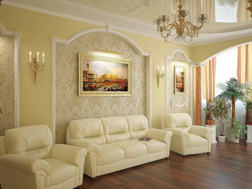 Наиболее удачным вариантом отделки их поверхности в классицизме считается фактурная штукатурка. Наряду с ней могут использоваться обои, деревянные панели, ткани и даже обычная краска. Стеновую поверхность может украшать абстракция или орнаментальный рисунок. Основным правилом оформления стен гостиной в классическом стиле является возможность отделывать сдержанным рисунком лишь одну из стен. В декоре остальных поверхностей должна выдерживаться монотонность. Неуместность ярких цветов в создании фона компенсируется рельефными украшениями в позолоте.
