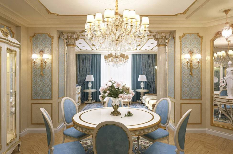 В классическом стиле оформляют все помещения квартиры: гостиную, кухню, столовую, спальню, даже балкон.