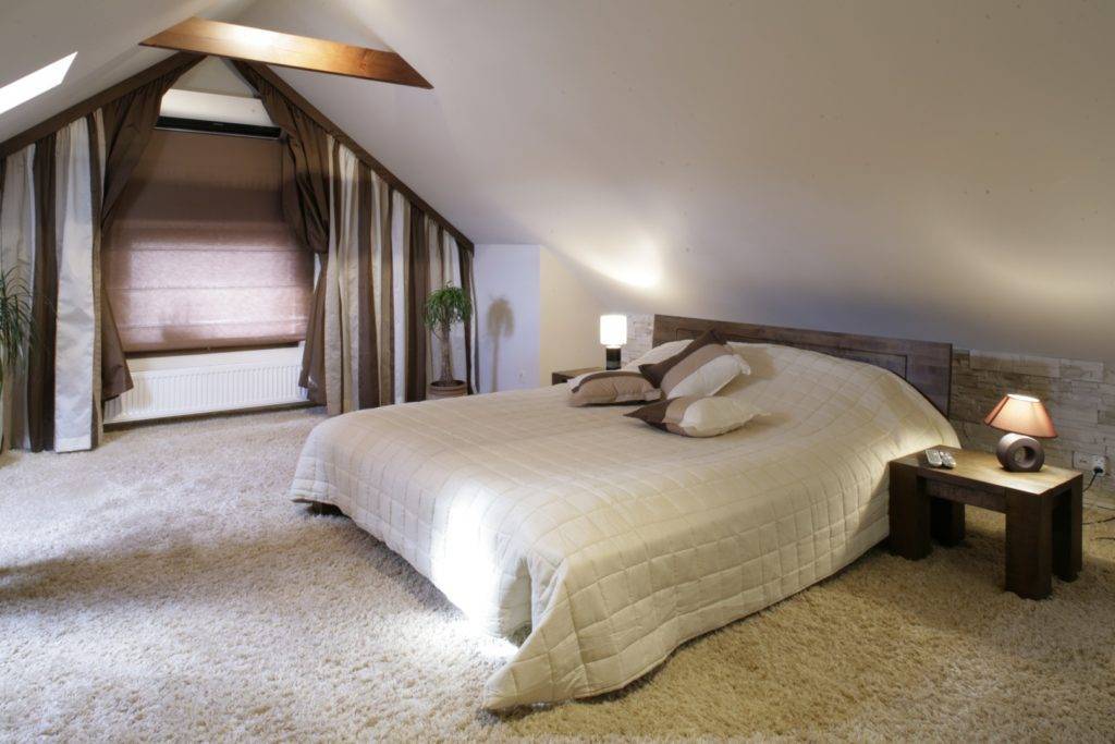 Спальня может быть устроена в небольшом чердачном помещении, но важно, чтобы в центральной части комнаты высота балки была выше человеческого роста, по краям под скатами крыши прекрасно расположатся кровати