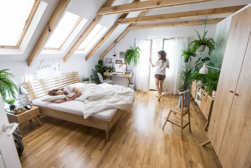 Мансардные спальни находятся вдали от шумной дневной зоны, поэтому они способствуют отдыху. К сожалению, они не лишены недостатков — большой наклон стен может затруднить обустройство комнаты.