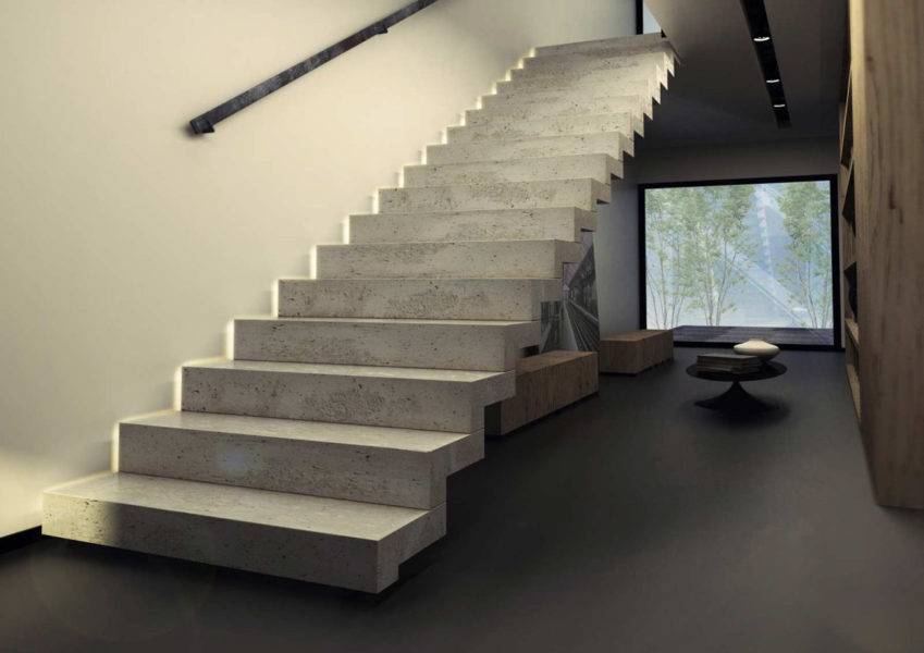 Бетонная лестница отличается долговечностью, устойчивостью к перепадам температур. В процессе эксплуатации изделие не подвержено деформации, отсутствуют скрипы. Уход за поверхностями несложен, лестницу просто мыть. Однако строительство бетонной лестницы следует планировать заранее. Нужно предусмотреть более усиленный фундамент.