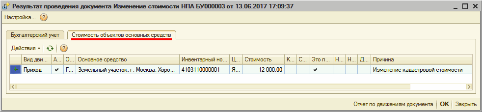 Кроме того, формируются движения по регистру накопления Стоимость объектов основных средств (рис. 3) для отражения изменения стоимости земельного участка в инвентарной карточке (ф. 0504031).
