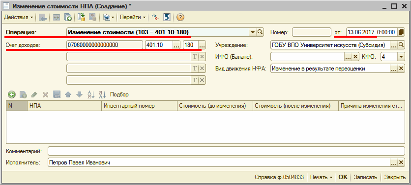 В документе следует выбрать операцию Изменение стоимости (103 – 401.10.180).