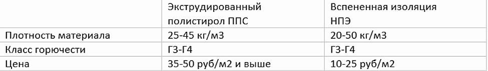 Таблица 3. Сравнение характеристик различных материалов, используемых для утепления