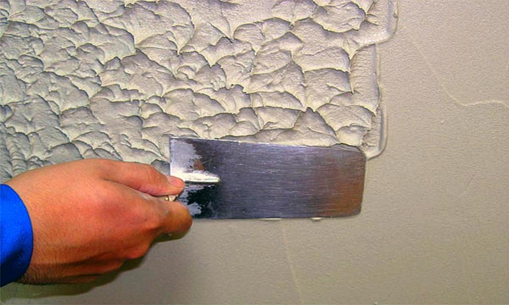 Используя ребро кельмы, снимают частички, которые отламываются с поверхности стены. Если акриловый вид шпаклевки высохнет полностью, то излишки фактуры отламываться не будут.