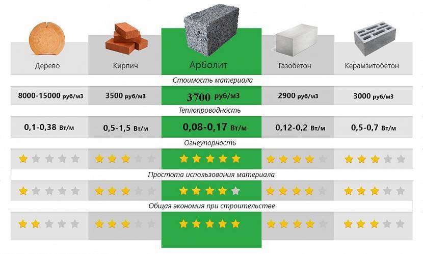 1 м3 блоков из конструкционно-теплоизоляционного арболита весит почти в 3 раза меньше кирпича и почти в 1,5 раза меньше керамзитобетона. Это позволяет существенно снизить затраты на возведение фундаментов под арболитовые стены.