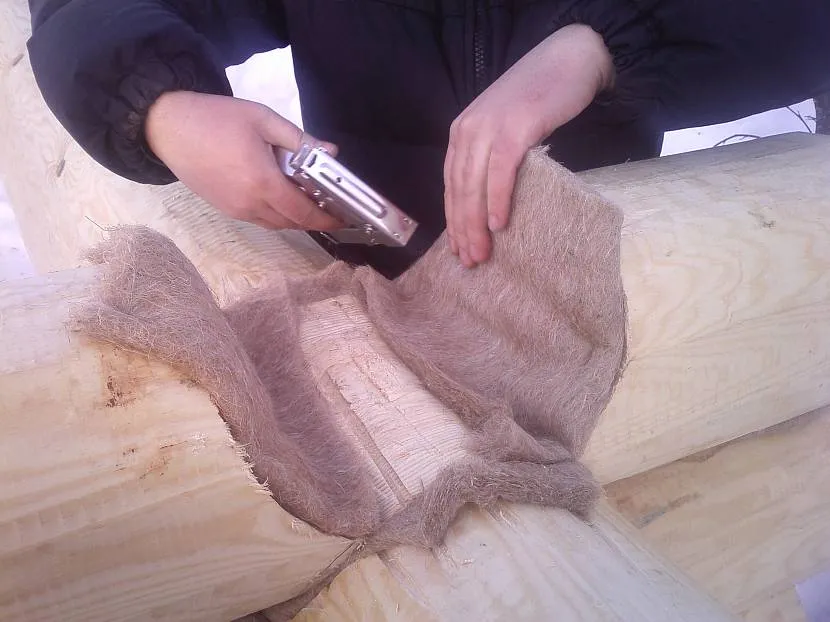 - После сборки. На этом этапе утеплитель прокладывают в стыках между бревнами таким образом, чтобы края материала свисали по обеим сторонам стены. Следует конопатить сруб после сборки сразу же, как только были возведены стены.