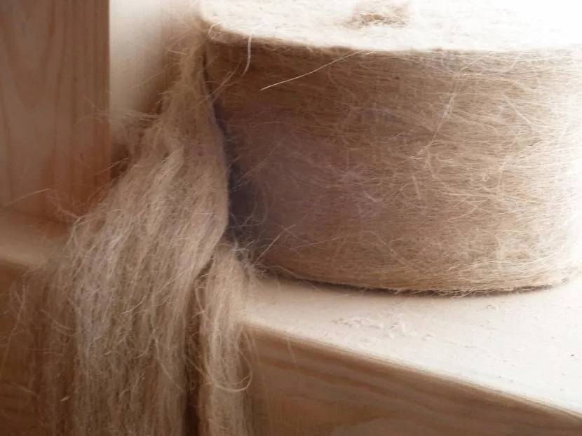 - Пакля льняная. Уплотнять брус можно паклей из льняного волокна. Она представляет собой отходы от изготовления полотен, веревок, канатов и так далее. У нее также имеются антисептические свойства, но по сравнении с мхом намного меньше. Пакля может быть обработана смолой — это сообщает ей устойчивость к влажности. Смолы используются натуральные. Возможна обработка нефтепродуктами, но в этом случае полученный материал нельзя считать экологически чистым. В пакле также содержится немало костры. Она вытряхивается наружу в первые годы эксплуатации строения. Конопатку надо будет повторять по мере потери костры материалом.