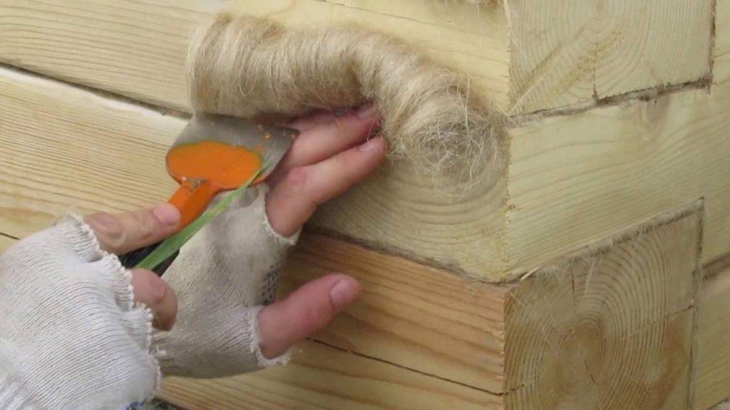 При возведении сруба материал укладывают меж венцами бревен, и он служит утеплителем. Материал в дальнейшем используется для конопачения. Проводится это как минимум 2 раза: используется после сборки сруба, после его усадки. Усадка происходит за 1,5–2 года, а иногда и более.