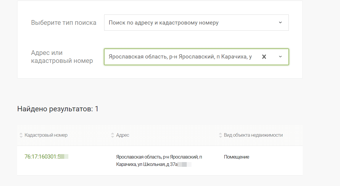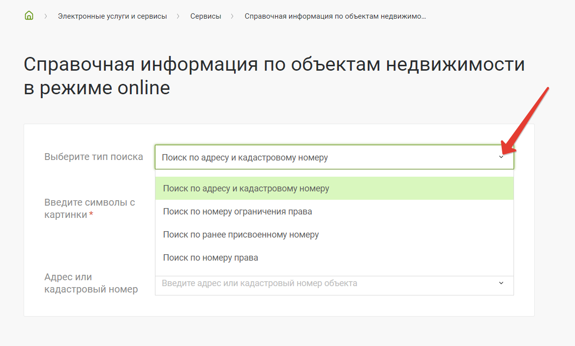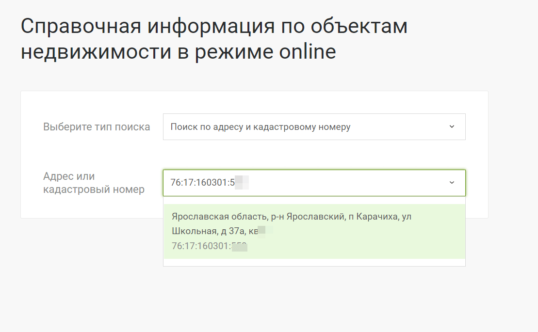 Выберите тип поиска.То есть по какой характеристике вы будете искать объект недвижимости.Если вы выбрали «Поиск по адресу и кадастровому номеру» — введите адрес объекта как в примере, если адрес не будет полностью совпадать с тем, как он зафиксирован в ЕГРН, информация выдана не будет.