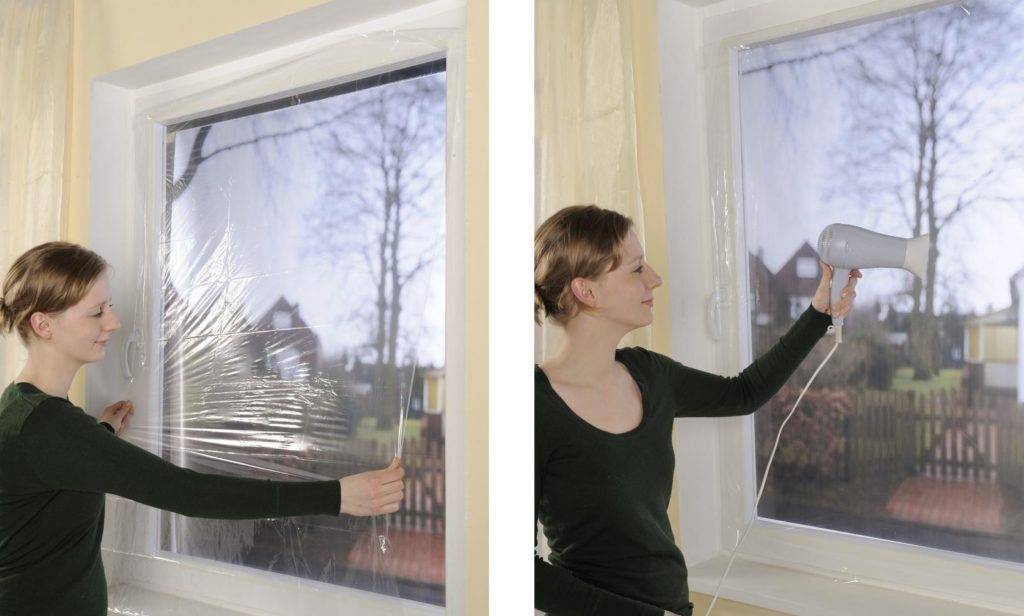 При работах с теплосберегающей пленкой сначала снимают защитную бумажную полоску с предварительно наклеенного по периметру рамы двустороннего скотча. Затем лист пленки разворачивают двумя руками и прикрепляют к одному из верхних углов рамы поверх липкой ленты, после чего, слегка натягивая, фиксируют ко всей горизонтальной полосе скотча до противоположного угла. На следующем этапе пленку потягивают вниз, давая возможность ей расправиться, и приклеивают к правому и левому нижним углам, после этого прижимают лист ко всей нижней и боковым вертикальным полоскам скотча.