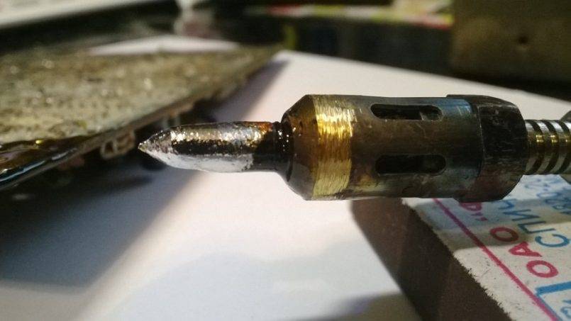 При работе полуда будет обгорать и стираться, поэтому паяльник придется очищать и лудить в процессе пайки несколько раз. Очистить жало можно о кусочек наждачной шкурки.