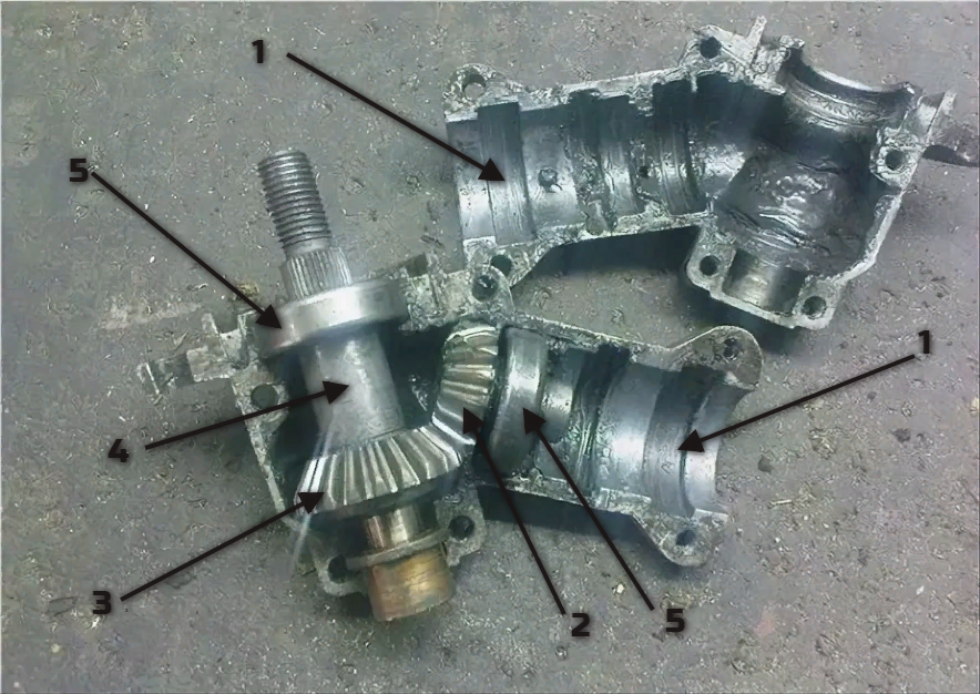 В дюралевом корпусе (1) расположен вал-шестерня (2) и зубчатое коническое колесо (3), запрессованное на ведомый вал (4). Для уменьшения сил трения при вращении, на опорных точках валов установлены подшипники качения (5). Любая зубчатая передача – это высоконагруженный механизм, длительность работы которого, бесшумность и надежность которого зависит в первую очередь от смазочного материала. Потому, кроме основных перечисленных выше составляющих устройство редуктора триммера включает в себя специальное отверстие, посредством которого можно без разборки узла смазать подшипники и шестерни.