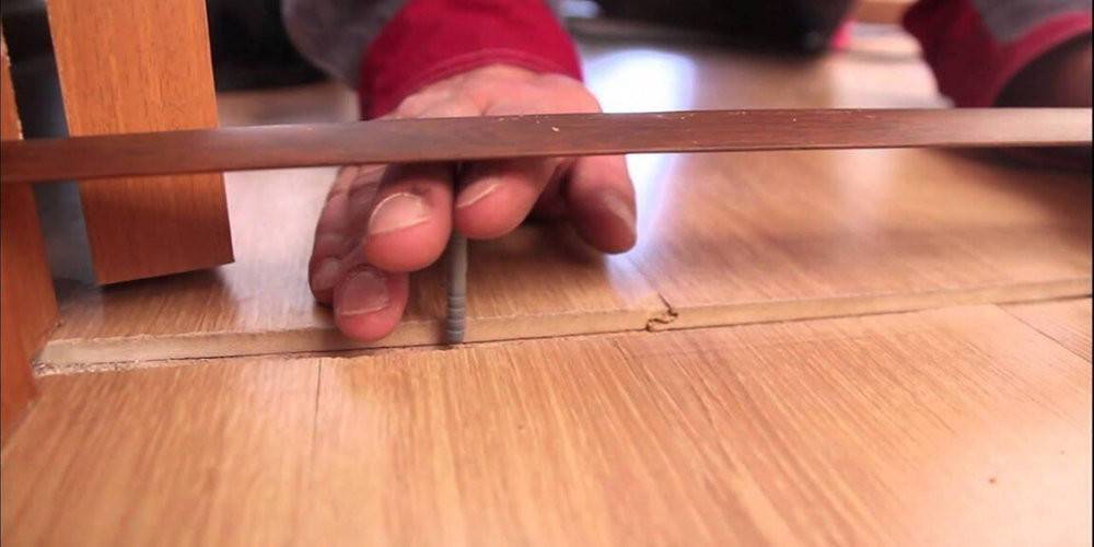 - Потом всю конструкцию вставляют в подготовленные отверстия. Уверенными ударами молотка через деревянный брусок, чтобы не повредить декоративную поверхность, порожек опускается до упора на стыке ламината.