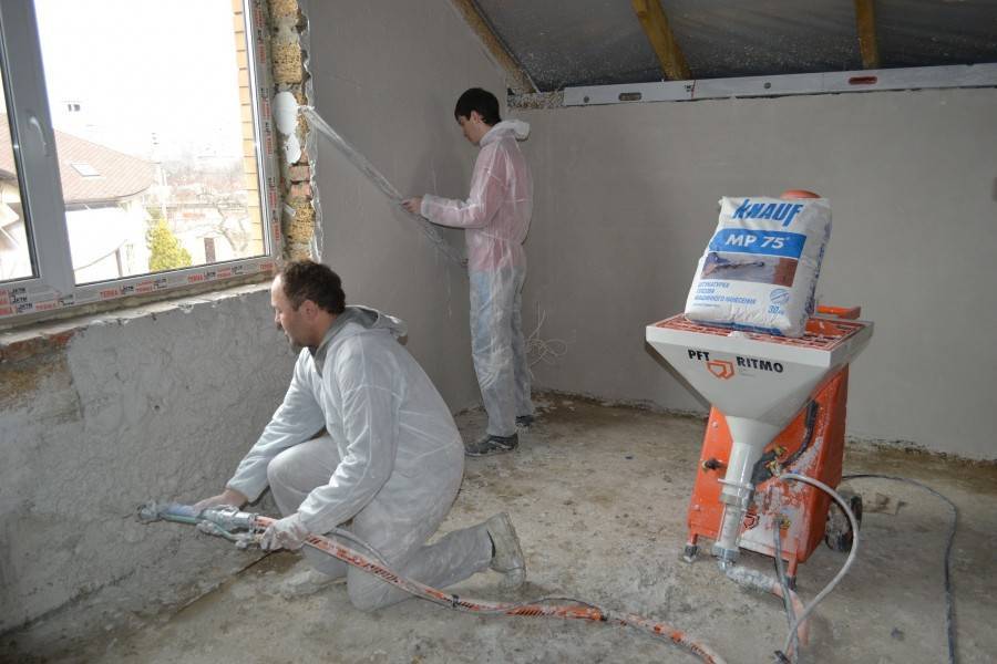 Сэкономить на работах можно, заказав машинную штукатурку. При высоком качестве и однородности наносимого слоя цена обработки квадратного метра минимум на треть ниже, чем при использовании ручного труда.