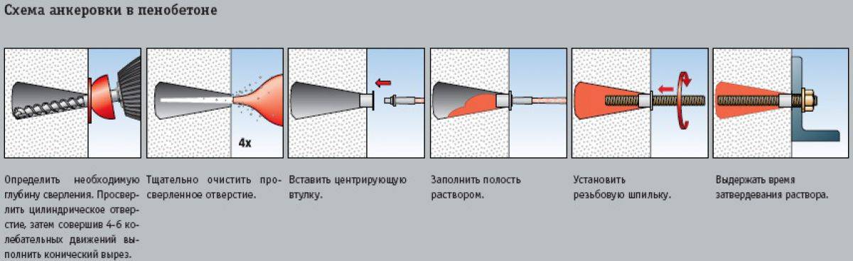 Еще прочнее держат химические анкера, они подходят для всех стеновых материалов из легких бетонов и для гипсокартона, да и для любых стеновых материалов. Принцип работы — способность синтетических смол глубоко проникать в поры и сцепляться с основанием. Слабым звеном крепления к пористым блокам и гипсокартону является не крепеж, а материал основы, особенно при действии вертикальной нагрузки, и как раз эти проблемы помогают решить химические анкеры. Вставляют химический анкер, применяя специальный пистолет. В засверленное отверстие выдавливают под давлением клеящую массу, и сразу вставляют крепежный элемент — шпильку с резьбой или шток. Клеевой состав заполняет поры газобетона или др. пористого блока, и после застывания образует прочное и надежное крепление. Усилие вырыва химического анкера из кирпича более 500 кг. Время службы химических анкеров — десятки лет, от температурных перепадов они не деформируются, к агрессивным средам инертны